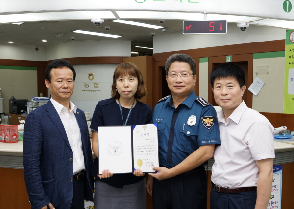이날 감사장을 받은 정ㅇㅇ(35세, 여, 농협직원)씨는, 지난 4일 평소 찾아오는 고객들을 관심 있게 보아 오던 중, 평소와 다르게 불안한 모습으로 전화통화를 하면서 타계좌로 입금하려는 모습을 보이는 이ㅇㅇ(여,60세)를 수상히 여겨 대화 시도한바, “대구에 거주하는 아들(35세)이 울면서 친구보증을 잘못 서 보증금 2천만원과 이자 350만원을 갚아야하는데 지금 누가 머리를 때리고 지하방에 감금되어 있다. 빨리 돈을 입금시켜 달라”는 협박 말을 믿고 돈을 입금하려온 것을 보이스피싱으로 판단, 112신고 및 콜센터를 통해 전화금융사기피해를 사전 예방 하였다.