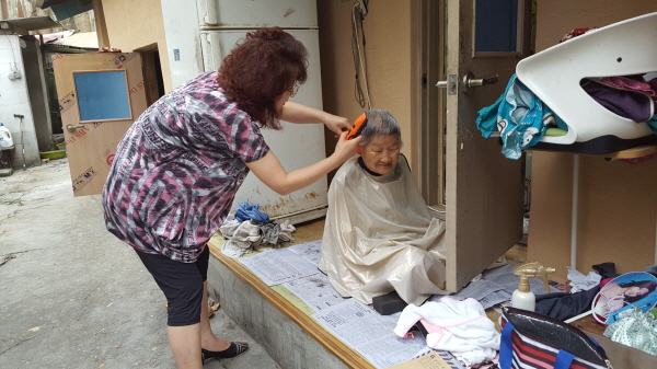오늘 처음 미용서비스를 받은 박정란(83세)님은 “다리가 아파 걸을 수도 없어 머리도 못 자르고 있었는데 이렇게 직접 와서 머리를 잘라주니 너무나 고맙고 기분까지 상쾌해진다”며 매우 기분 좋아하셨다.