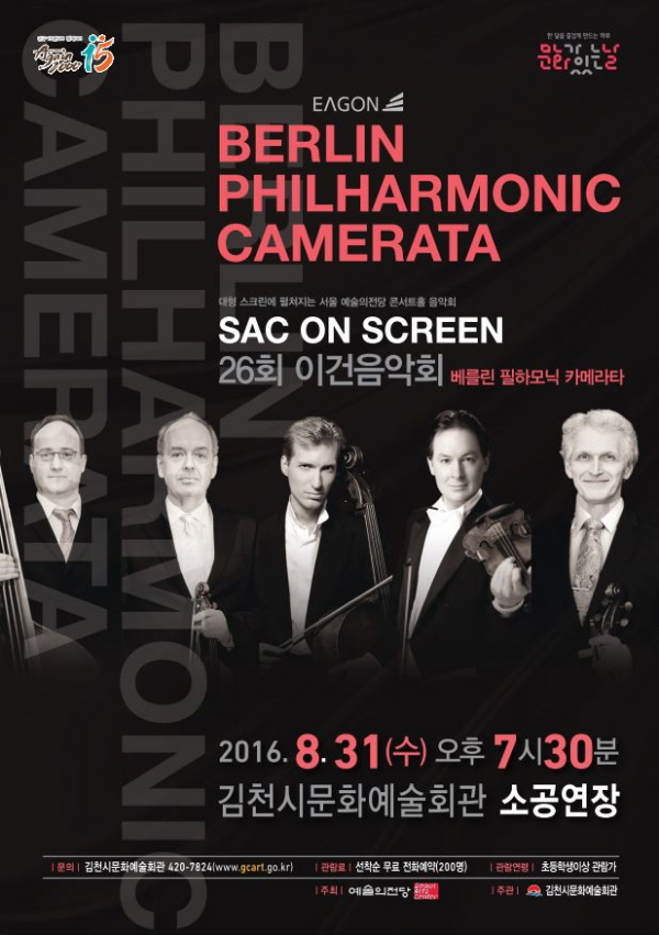 | 김천시문화예술회관(관장 장귀희)에서는 8월 31일(수) 오후 7시30분 문화가 있는 날을 맞이하여 ‘SAC on Screen’ (공연영상화 사업)의 일환으로 서울 예술의 전당에서 제공한 영상『베를린 필 하모닉 카메라타 음악회』를 문화예술회관 소공연장에서 상영한다.