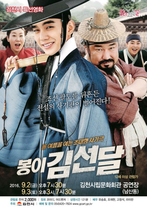 | 김천시문화예술회관(관장 장귀희)에서는 시민들에게 건전한 여가선용과 볼거리를 선사하기 위하여 특선영화『봉이 김선달』을 오는 9월 2일(금) 오후 7시 30분과 9월 3일(토) 오후 3시, 오후 7시 30분 3회에 걸쳐 김천시립문화회관 공연장에서 상영한다.