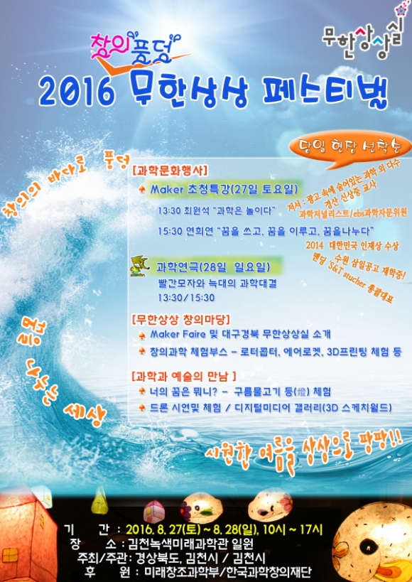 | 김천시는 김천녹색미래과학관에서 2016년 무한상상 페스티벌을 오는 8월 27일부터 28일까지 2일간 개최한다고 밝혔다.
