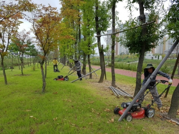 방문객들이 많이 찾는 강변공원 외 59개소, 영남대로 외 49개 주요노선 가로수 왕벚나무외 7종 수형조절, 조경지, 둔치, 문형화단 등에 조경수 전정, 잔디깎기, 제초작업 및 병해충방제 등 조경인력을 집중 투입하여 도심 내 미관개선에 최선을 다하고 있다.