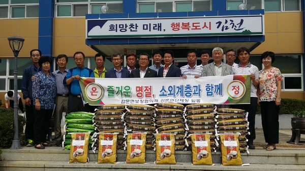 감문면 보장협의체와 감문면 18개 기관단체에서 추석을 맞이하여 어려운 이웃을 생각하는 온정을 담아 십시일반으로 모은 성금으로 백미를 구입하여감문면 거주 기초생활수급자, 차상위계층, 독거노인, 장애인 등 소외계층을 대상으로 직접 전달하여 이웃사랑 실천의 시간을 가졌다.