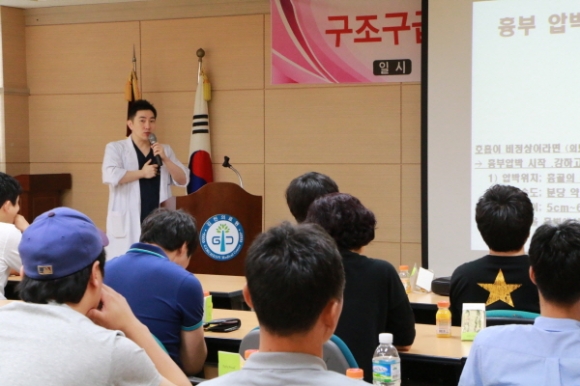 | 김천소방서 요청으로 마련된 이날 훈련에는 이현희 의료원 응급의학과장이 강사로 나서 심정지에 대한 정의 및 상황에 따른 효과적인 심폐소생술(이하 CPR) 방법, 경추 손상 환자 응급 처치법, 외상 환자 처치술 등에 대해 상세히 설명했다.