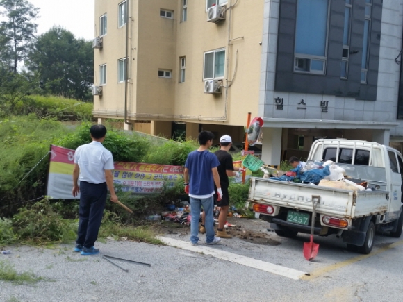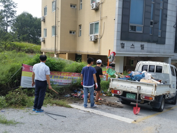 | 이날 화물차 1대, 직원 ․ 통장 등 15명이 참여하여 생활불법쓰레기 등 3톤 분량을 수거하고 주변을 깨끗하게 정비하였다.