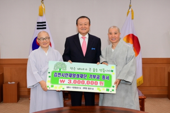지난 12일 2층 접견실에서 수정(법성)스님과 일공스님은 “작은 금액이지만 어렵게 공부하고 있는 지역 학생들에게 희망과 도움을 주고 싶어 마음을 모아 김천시인재양성재단에 장학기금을 기탁하게 됐다.”고 말했다.