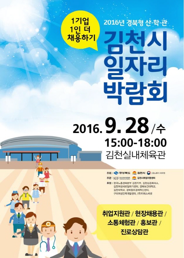 김천시(시장 박보생)에서는 지역의 일자리 문제와 기업체가 안고 있는 구인난을 해소하기 위해 오는 9월 28일 수요일 오후 3시부터 오후 6시까지 김천실내체육관에서 「2016년 김천시 일자리 박람회」를 개최 한다.