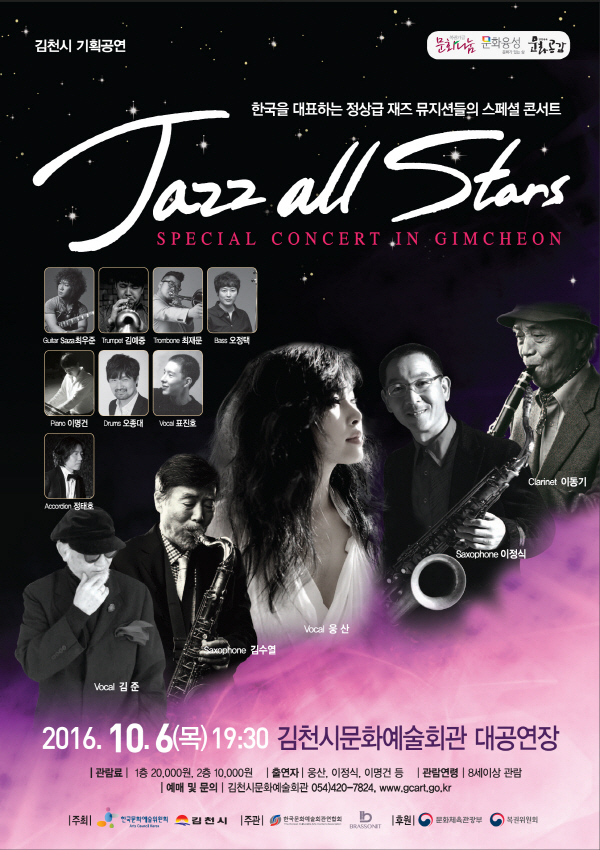 김천시문화예술회관(관장 장귀희)에서는 10월 6일(목) 오후 7시30분 기획공연『재즈올스타즈 스페셜 콘서트』를 대공연장에서 개최한다.