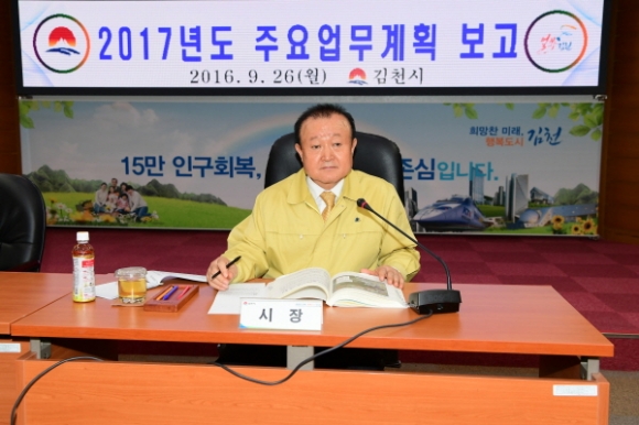 김천시(시장 박보생)는 민선6기 3년차를 준비하고, ‘희망찬 미래, 행복도시 김천’ 건설을 위한 2017년도 주요업무계획 보고회를 9월 26일(월)부터 시청 2층회의실 에서 개최한다.
