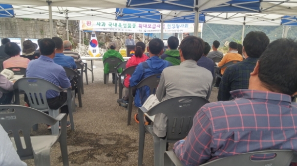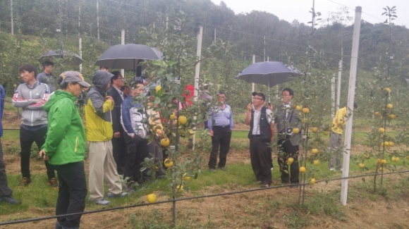 김천시(시장 박보생)는 지난 28일 증산면 수도리에서 농촌진흥청 관계자 및 농업인 150명을 대상으로 사과 국내육성품종 확대보급사업 현장평가회를 개최하였다.