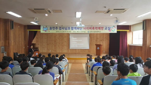 김천신일초등학교(교장 이종배)는 9월 28일(수) 본교 시청각실에서 대구지방법원 김천지원 송민주 검사를 강사로 초청하여 사이버폭력 예방교육을 실시했다.