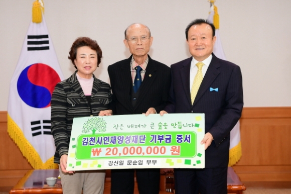 김천의 교육발전과 글로벌 인재육성을 위해 지난 6일 강신일, 문순임 노부부가 김천시인재양성재단(이사장 박보생)에 장학기금 이천만원을 기탁했다.