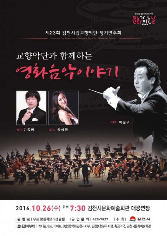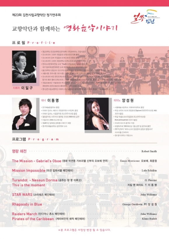 | 김천시문화예술회관(관장 장귀희)에서는 10월 26일(수) 오후 7시 30분 대공연장에서 ‘교향악단과 함께하는 영화음악이야기’로 시립교향악단 제23회 정기연주회를 개최한다.
