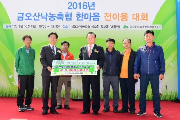 지난 10월 19일 금오산낙농축산업협동조합 한마음 전이용대회 행사장에서 조명식 조합장 및 임원진은 “ 지역의 우수한 인재육성에 조금이나마 보탬이 되고자 회원들의 마음을 모은 장학기금 삼백만원을 김천시 인재양성재단에 기탁하게 됐다”고 말했다.