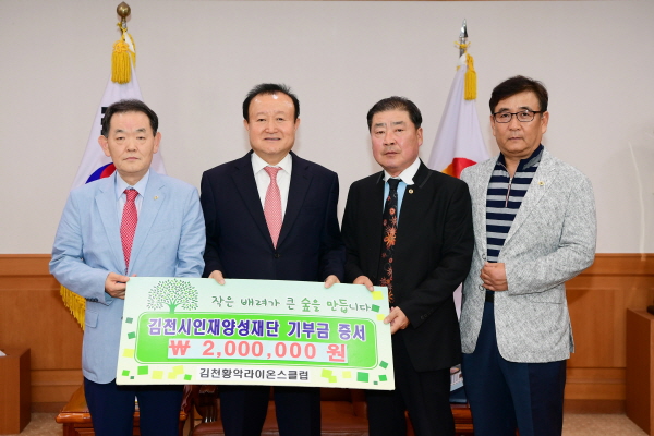 김천의 교육발전과 글로벌 인재육성을 위해 김천황악라이온스클럽 전 회장 및 임원진에서 김천시인재양성재단(이사장 박보생)에 장학기금 이백만원을 기탁했다.