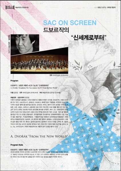 | ‘공연영상화 사업’은 지역문화의 격차를 좁히기 위한 프로젝트로 우수공연을 스크린을 통해 온국민이 함께 보고 즐길 수 있도록 기회를 제공하고 있다. 이번 작품은 흑인, 인디언의 음악적 요소와 보헤미안의 감성이 절묘하게 융합된 드보르작의 ‘교향곡 제9번 e단조 Op.95 신세계로부터’로 매년 90회이상의 공연을 통해 국내 교향악의 한 축을 담당하는 코리안심포니 오케스트라(지휘자 임헌청)가 연주한 공연이다.