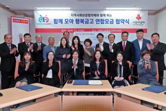 |  | | | ⓒ 김천내일신문 | | 경북사회복지공동모금회(회장 신현수)는 지난 10월 25일, 경북사회복지공동모금회 대회의실에서 풀뿌리 기부문화 확산과 지역 복지 사각지대의 온전한 해소를 도모코자 도내 지역사회보장협의체와 ‘함께 모아 행복금고’ 연합모금사업 업무협약을 체결했다.