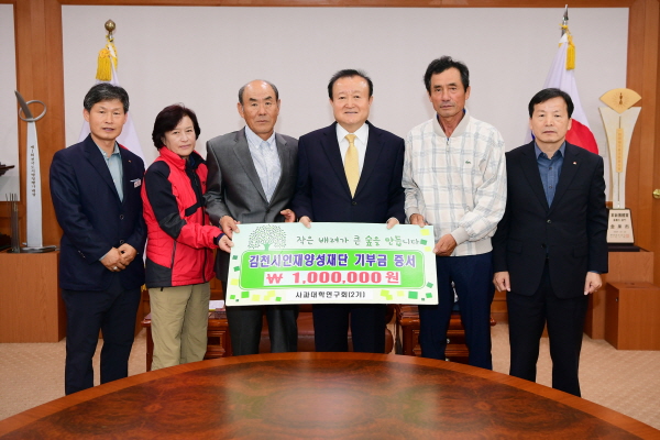 | 김천의 교육발전과 글로벌 인재육성을 위해 사과대학연구회 2기(회장 송영택)에서 김천시인재양성재단(이사장 박보생)에 장학기금 일백만원을 기탁했다.