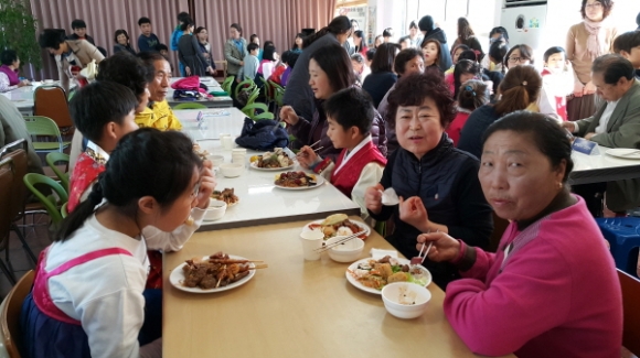 관내 기관장님을 비롯한 내빈들과, 조부모, 부모, 자녀, 그리고 학교주변 어르신 등 100여 명이 참석하여 성황리에 진행된 『할매할배의 날 2016 밥상머리교육』은 전문강사의 밥상머리 예절교육, 함께 식사하기, 설문지 작성, 소감발표의 순서로 진행되었다.