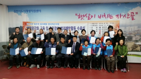 | 김천시 자산골 도시재생 주민협의체(위원장:최상동) 회원 20여명은 11월 9일 자산경로당 2층에서 「법역량강화교육 및 주민참여 범죄예방활동」교육을 마치고, 수료식을 가졌다.