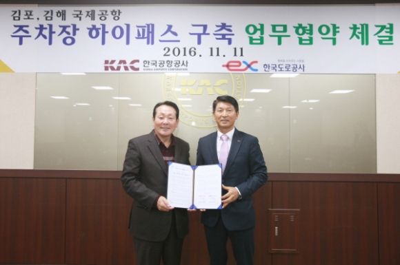 한국도로공사(사장 김학송)는 한국공항공사(사장 성일환)와 11일 오전 11시 한국공항공사 청사에서 이 같은 내용이 포함된 상호 협력 업무협약을 체결한다고 밝혔다. 양 기관은 이번 협약을 통해 내년 상반기까지 김포공항 및 김해공항 주차장에 하이패스 결제 서비스를 설치하는 것을 목표로 상호 협력하기로 했다. 설치가 끝나면 하이패스 단말기를 장착한 차량은 정차하지 않고도 주차요금을 지불할 수 있게 된다.