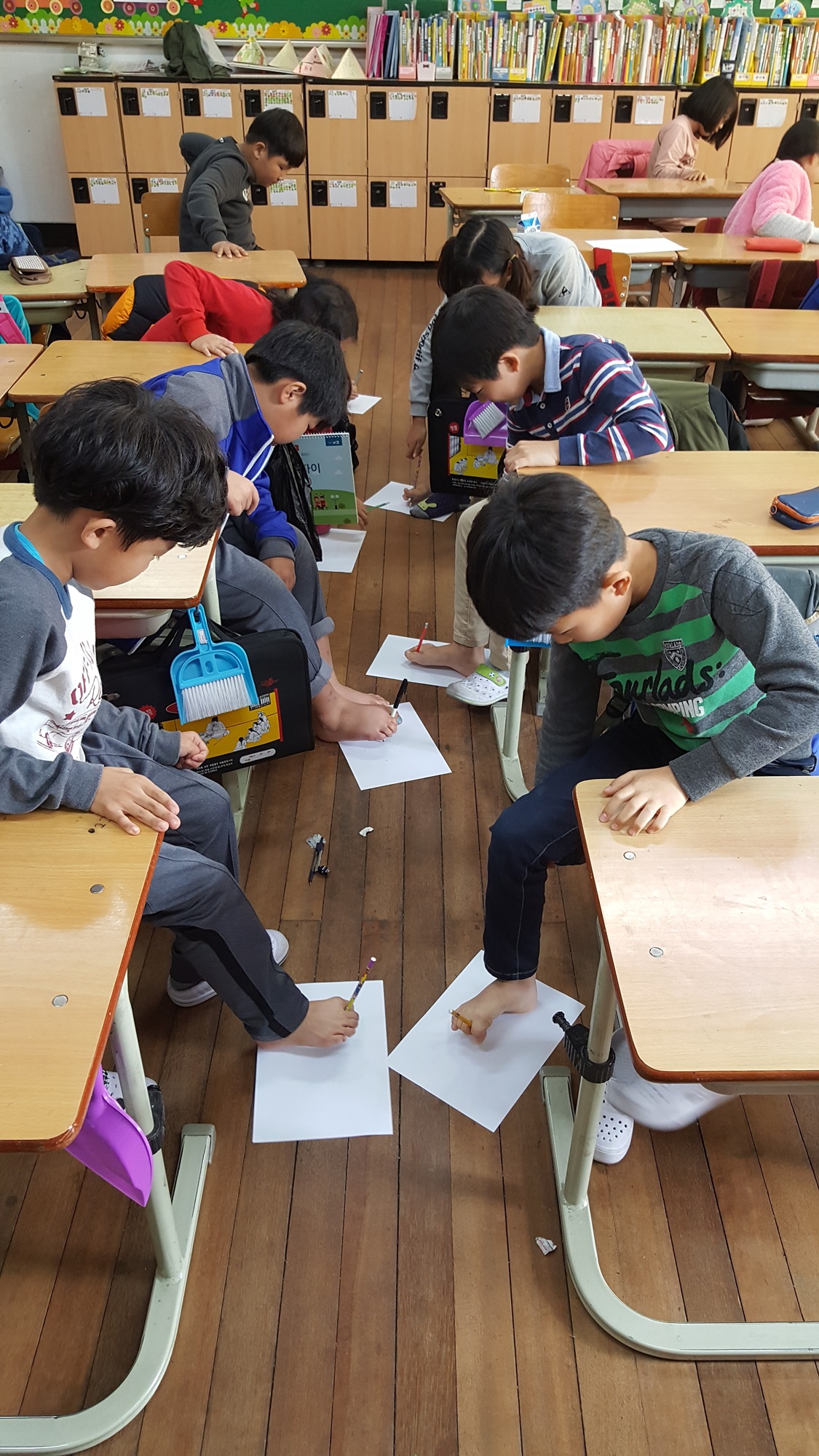 | 이번 그루터기학교에서는 차씨네 쌍둥이 이야기를 통해 차별과 차이에 대해 알아보고, 그림으로 된 장애인차별금지법에 대해 알아보는 시간을 가졌다. 특히, 구족화가 표형민의 영상이 아이들의 눈길을 끌었다. 구족화가가 되어, 직접 그림을 그려봄으로써 자신이 가지고 있는 신체의 고마움, 장애를 가진 사람들이 얼마나 불편한지 알아보는 시간을 가졌다. ‘발로 그림 그리기, 거울 속 미로 찾기’ 등의 직접적인 체험을 통해 장애를 이해하는 시간을 가지게 되었다.