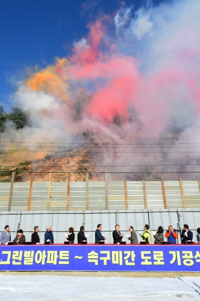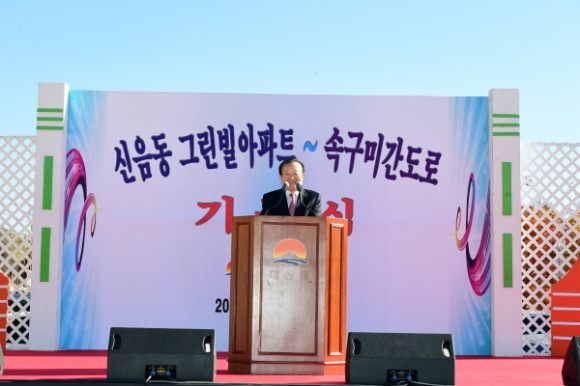 김천시(시장 박보생)는 11월 15일 교동과 속구미를 잇는 3.57km 구간 중, 아직 미 확장된 신음동그린빌APT ~ 속구미까지의 1.07km(폭25m) 구간에 대한 도로확장공사의 기공식 행사를 가졌다.