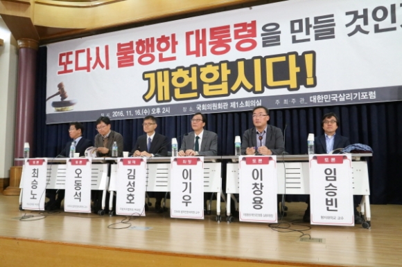16일 국회에서 ‘대한민국살리기포럼’ 대표를 맡고 있는 새누리당 이철우 의원이 ‘또다시 불행한 대통령을 만들것인가. 개헌합시다’라는 주제로 토론회를 개최한데 이어 오는 21일에는 손학규 전 민주당 대표가 ‘개헌을 통한 연정형 권력구조의 제도화’라는 주제로 토론회를 열 예정이어서 정치권에 개헌논의가 본격화될 전망이다.