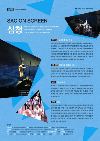| 김천시문화예술회관(관장 장귀희)에서는 ‘공연영상화 사업(SAC on Screen)의 일환으로 서울 예술의전당에서 공연한 발레『심청』을 오는 11월 30일(수) 오후 7시 30분 김천시립문화회관 공연장(남산동)에서 대형스크린을 통해 상영한다.