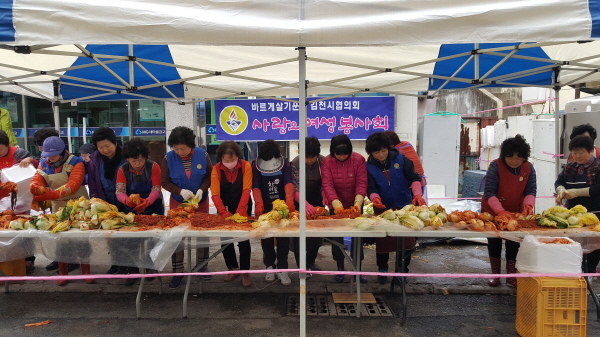 사랑의 김장 김치는 올해 21년째 지속해 오고 있는 행사로 여성봉사회 회원 40여명이 21일과 22일 양일에 걸쳐 김장을 하여 소년·소녀가장, 독거노인, 장애인세대 등 70여 가구에 김치 400포기 전달하여 이웃사랑을 실천했다.