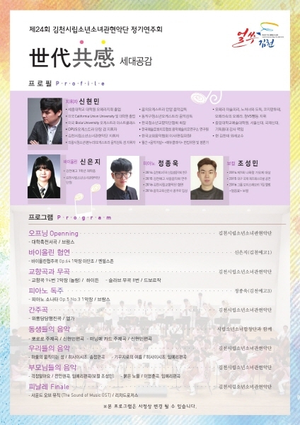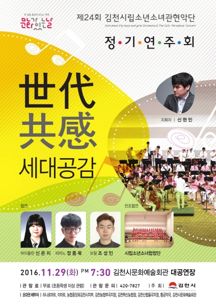 장귀희 김천시문화예술회관장은 ‘열심히 실력을 갈고 닦은 우리 소년소녀관현악단의 공연에 많은 시민들이 오시어 한층 성장한 아이들에게 큰 박수로 격려해 주시고 클래식을 통한 세대공감의 시간을 누리시길 바란다’고 했다.