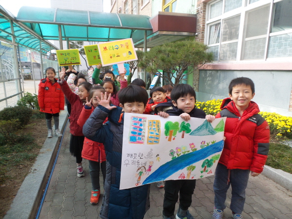 사전활동으로 어린이들은 우리 유치원 바깥놀이터에 주변에 쓰레기가 버려진 사진들을 보며 깨끗한 유치원을 만들 수 있는 방법을 이야기 나누고 초등학교 형님들에게 깨끗한 우리 유치원을 만들자는 뜻을 전달하기로 했다. 어린이들은 ‘쓰레기 때문에 나무가 아파해요’, ‘깨끗한 우리 유치원을 만들어요.’ 등의 문구가 적힌 피켓과 어깨띠를 메고 유치원 주변을 돌아보았다.