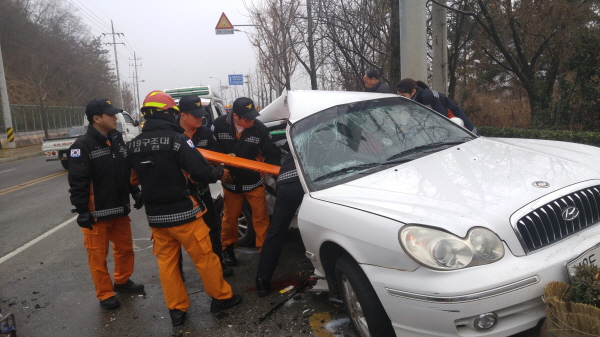 | 김천소방서 출동대가 사고현장에 도착한바, 전날 내린 눈으로 노면이 결빙되어 있는 상태로 승용차량 2대가 충돌하면서 요구조자 1명이 차량내에 갇혀있어 유압스프레다 등 유압구조장비를 사용해 차량 문개방하여 구조를 완료하였다.