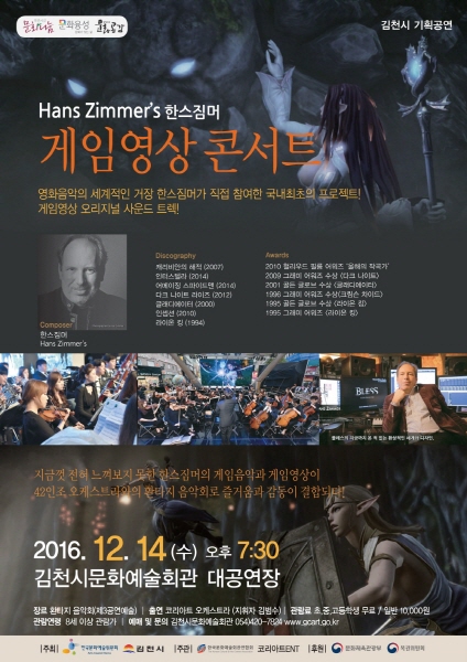 김천시문화예술회관(관장 장귀희)에서는 12월 14일(수) 오후 7시 30분 기획공연 「한스짐머의 게임영상콘서트」를 대공연장에서 개최한다.
