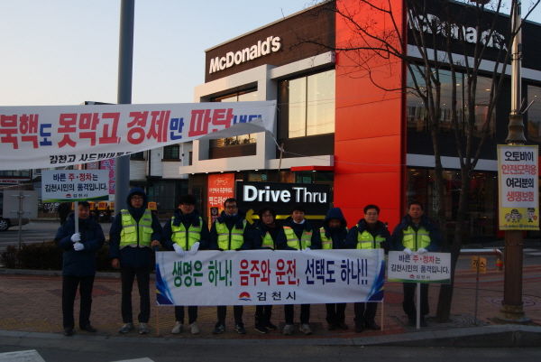 | 김천시는 12월 15일(목) 신음동 직지교사거리에서 김천경찰서, 모범운전자회, 녹색어머니회, 교육청 직원 등 50여 명이 참석하여 시민들을 대상으로 「연말연시 음주운전 근절」 관계기관 합동 캠페인을 벌였다.