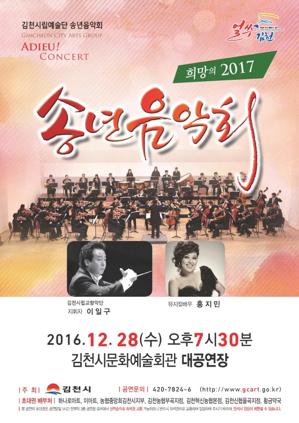 김천시는 12월 28일(수) 저녁 7시 30분 김천시문화에술회관 대공연장에서 다사다난했던 2016년 병신년을 되돌아 보고 희망의 2017년을 기원하는 시립예술단 『송년음악회』를 개최한다.