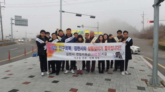김천시 아포읍(읍장 김병진)과 이장협의회(회장 박희병)는 지난 20일 김천시와 구미시 인근 유동인구가 많은 주요도로변인 송천삼거리에서 출근하는 시민들을 대상으로 김천시 15만 인구회복을 위한 전입홍보 캠페인을 실시하였다.