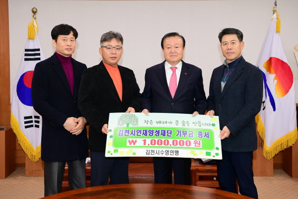 김천의 교육발전과 글로벌 인재육성을 위해 김천시수영연맹(회장 황현수)에서 김천시인재양성재단(이사장 박보생)에 장학기금 일백만원을 기탁했다.