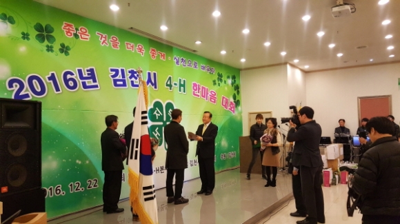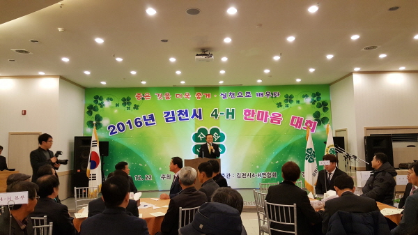 김천시4-H본부(회장 지용석)와 김천시 4-H연합회(회장 강만섭)는 지난 12월 22일 탑웨딩 로즈마리홀에서 4-H회원, 4-H본부지도자 및 지도교사, 관계자 160여명이 한자리에 모인 가운데 2016년도 『김천시4-H한마음대회』를 개최하였다.