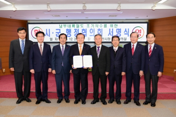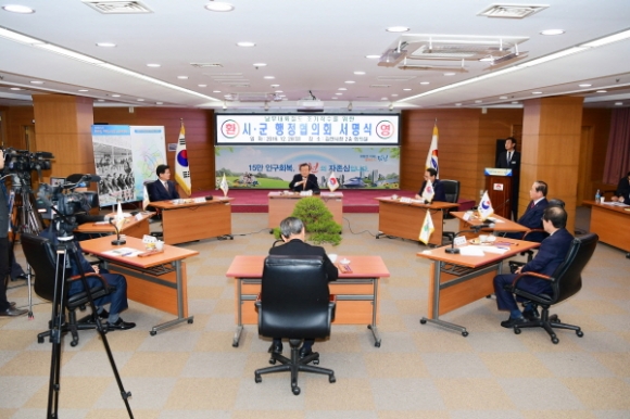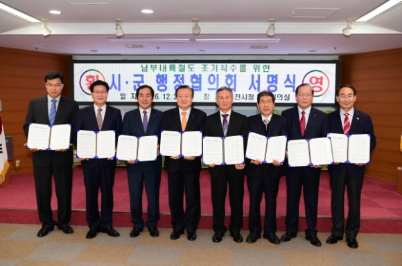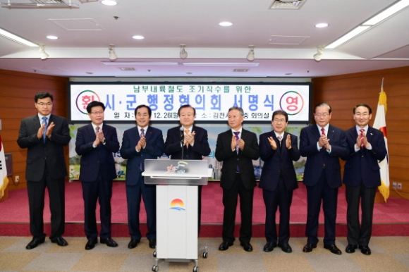 | 박보생 김천시장은 26일 남부내륙철도가 통과하는 해당 시․군의 자치단체장들로 구성된 『남부내륙철도 시·군 행정협의회』출범을 알리는 서명식을 개최하고, 현재 남부내륙철도사업 착수에 앞서 현재 진행 중인 예비타당성조사의 조속한 마무리를 위한 대정부 촉구성명서를 발표했다.