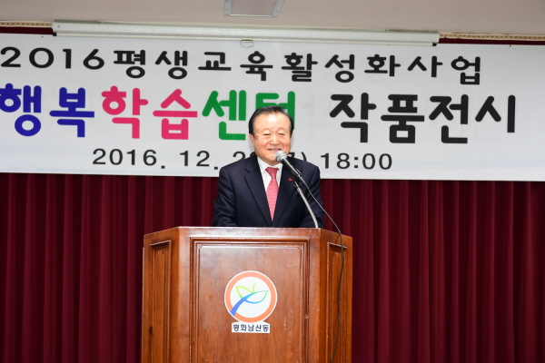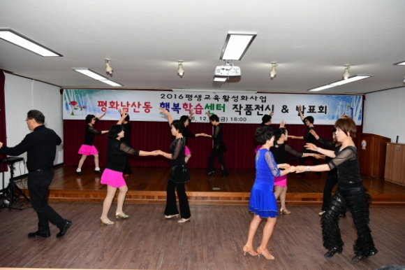 | 2016 평화남산동 행복학습센터 작품전시 & 발표회는 플라워클래스 및 캘리그라피반에서는 직접만든 작품을 전시하였고, 댄스스포츠(A팀, B팀), 노래교실, 코아요가팀에서는 지금까지 배운 실력을 알리는 발표회로 이어졌으며, 지역주민이 함께하는 화합의 합창으로 마무리하였다. 학습 발표는 수준 높은 공연으로 주민 모두가 하나 되는 한바탕 축제의 분위기를 만들었다.