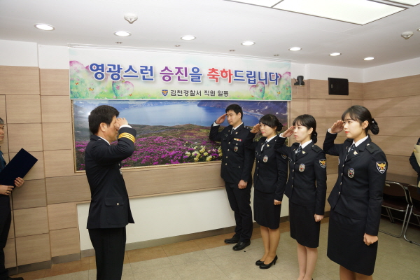 김영수 김천서장은 ‘승진이 꼭 목적은 아니지만, 승진을 하는 것은 모두의 희망이고, 기쁨이다. 하지만 그에 따른 책임감과 의무 또한 막중함을 인식해야’ 한다고 당부 하였다. |