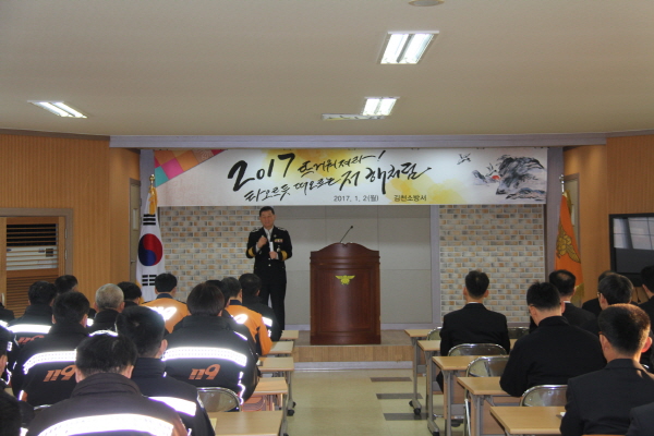 | 김천소방서(서장 백남명)는 1월 2일 3층 대회의실에서 희망찬 정유년 새해를 어느 해보다 열정적으로 시작하기 위한 2017년 시무식 행사를 가졌다.