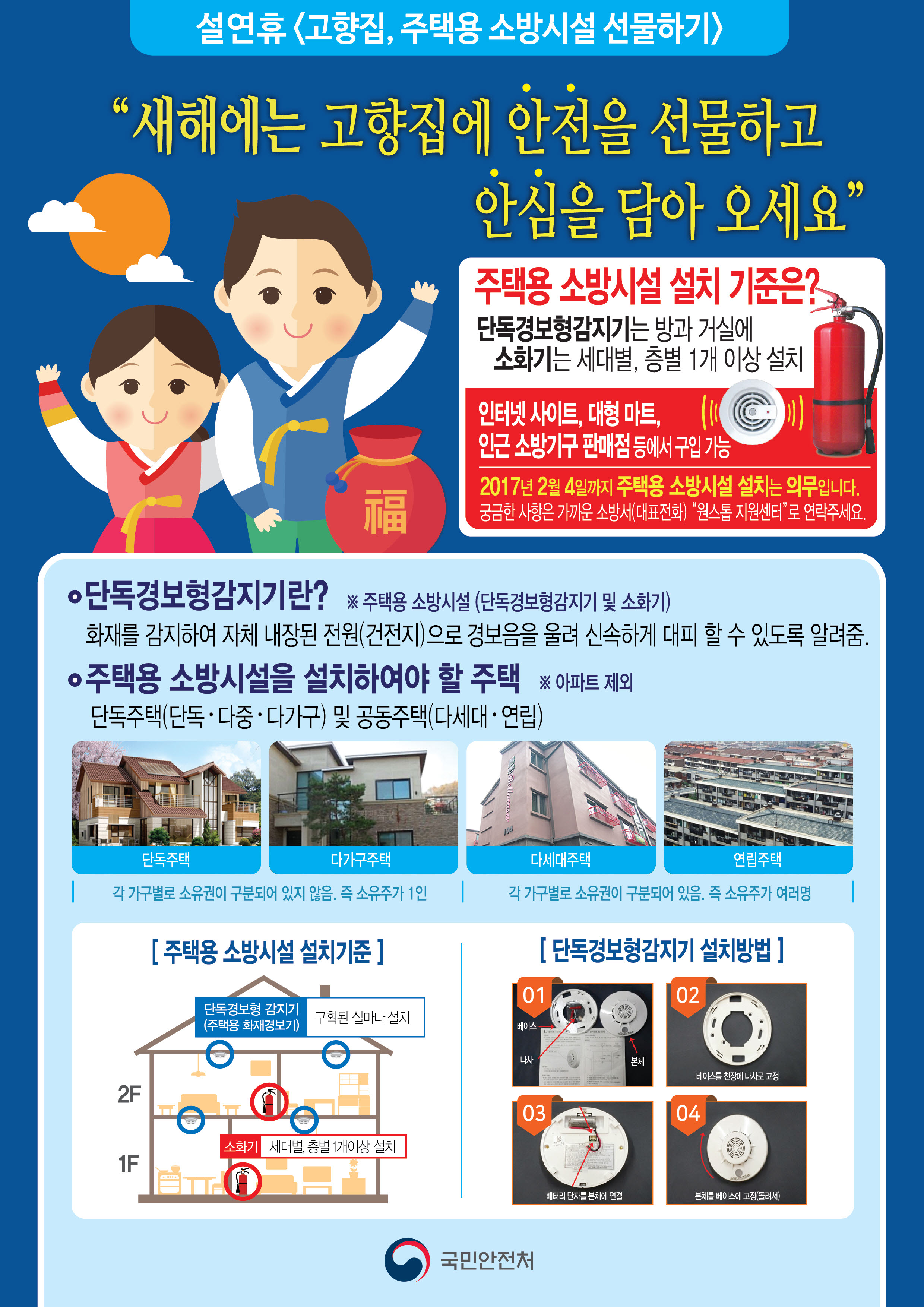 「화재예방, 소방시설 설치·유지 및 안전관리에 관한 법률」제8조에 따라 아파트를 제외한 일반주택(단독·다가구·다세대·연립주택 등)의 소유자는 ‘주택용 소방시설(단독경보형감지기 및 소화기)’를 의무적으로 설치하여야 하며 기존 일반주택의 경우 2017.2.4.까지 설치를 완료하여야 한다.
