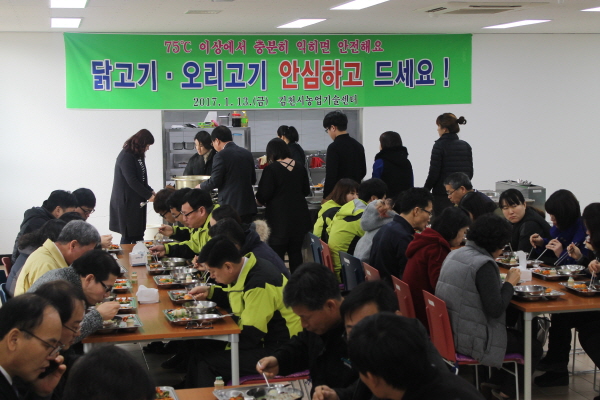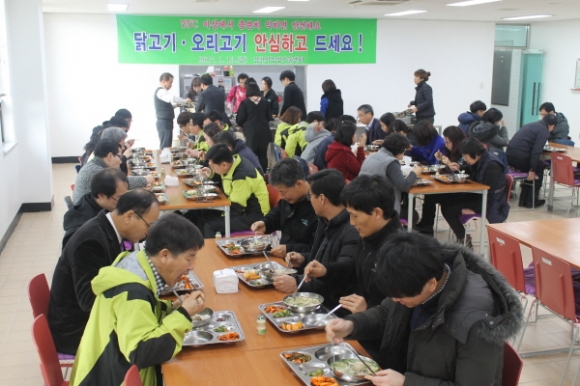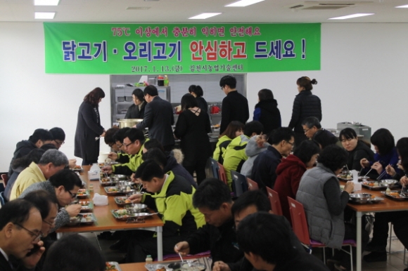 김천시농업기술센터(소장 전인진)는 1월 13일 구내식당에서 점심메뉴로 닭백숙을 선정해 직원 60여명이 참여한 가운데 닭고기 소비촉진을 위한 행사를 가졌다.