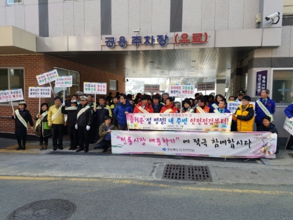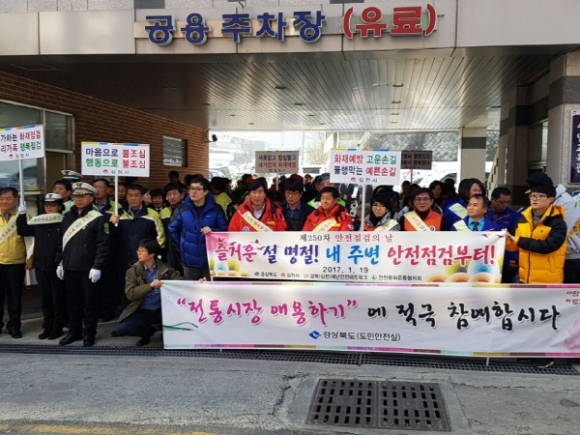 김천시(시장 박보생)는 제250차 안전점검의 날을 맞아 경상북도, 김천소방서와 합동으로 재난안전네트워크 단체 회원 200여명이 참석한 가운데 평화시장에서 안전한 설 보내기 캠페인 및 전통시장 장보기 행사를 가졌다.