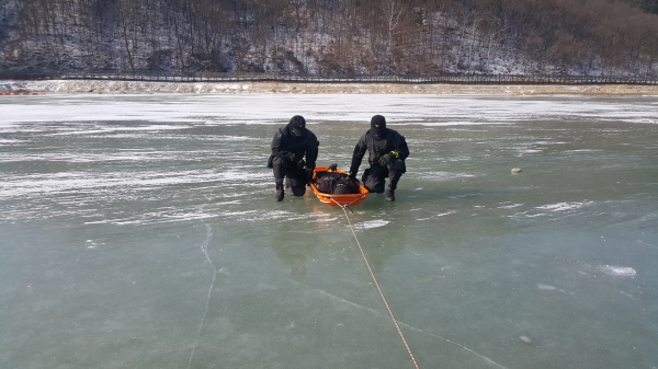 | 이번 훈련은 동계수난구조훈련으로써 저수지 얼음위에서의 요구조자를 구조하는 기법과 수중구조훈련을 병행하였다. 겨울철 얼음놀이를 하다 사고가 발생할 수 있는 가정하에 요구자에게 안전하게 접근하는 방법과 끌어올기기방법 등 심폐소생술 및 기본 응급처치, 2인 탐색법(원형탐색, 반원탐색), 잠수장비 활용법 등을 중점적으로 진행하였다.