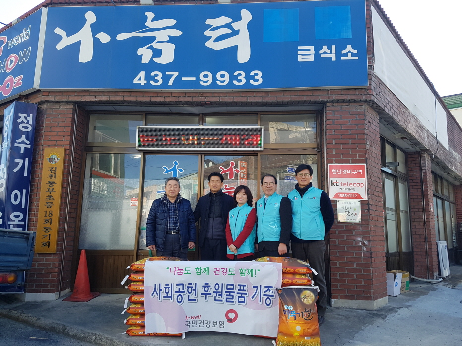 한편 건보 김천지사는 매주 독거노인세대 사랑의 도시락 배달과 장애인시설 및 아름다운가족 자매결연하여 물품을 지원하는 등 따뜻한 마음으로 국민과 함께 더불어 살아가는‘나눔의 세상, 건강한 세상’을 만드는데 모든 직원들이 변함없는 실천으로 훈훈한 사회 분위기 조성과 나눔 문화 확산에 기여해 오고 있다 |