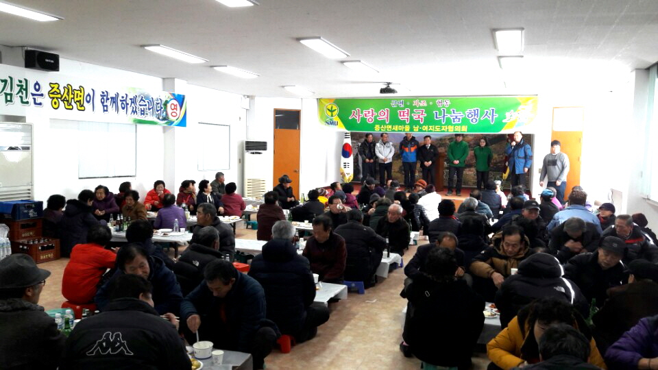 | 증산면, 새마을(남·여)지도자(협의회장 임상훈, 부녀회장 이민숙)회원22명은 관내 어르신 150여명을 모시고 지난 2월 6일 『면사무소 2층 회의실』에서 정유년 새해를 맞아 사랑의 떡국 나눔 봉사를 실천하여 훈훈한 정을 나누었다.