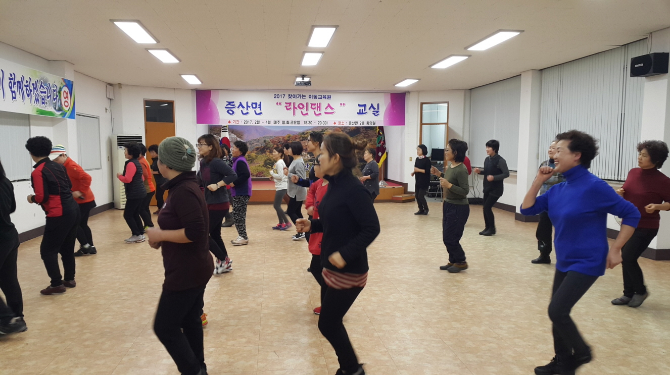 김천시 평생교육원의 지원을 받아 운영하는 증산면 『라인댄스 교실』은 2월에서 4월까지 매주 3회씩(월,화,금요일) 관내 주민을 실시한다. 주민들이 희망하는 강좌를 사전에 조사하여 라인댄스 교실을 선택한 것에 대하여 주민들의 참여와 만족도는 상당히 높게 나타나고 있다.